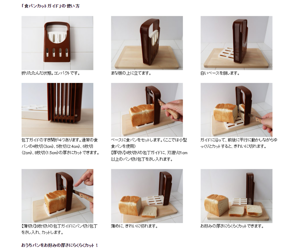 Easily slice homemade or bakery made unsliced bread at home with this convenient bread slicer. Perfect for those home bakers. Can be folded for convenient storage options. Comes with measuring guide that lets you cut into 4, 5, 6 or 8 slices of bread depending on the desired thickness. Made in Japan.