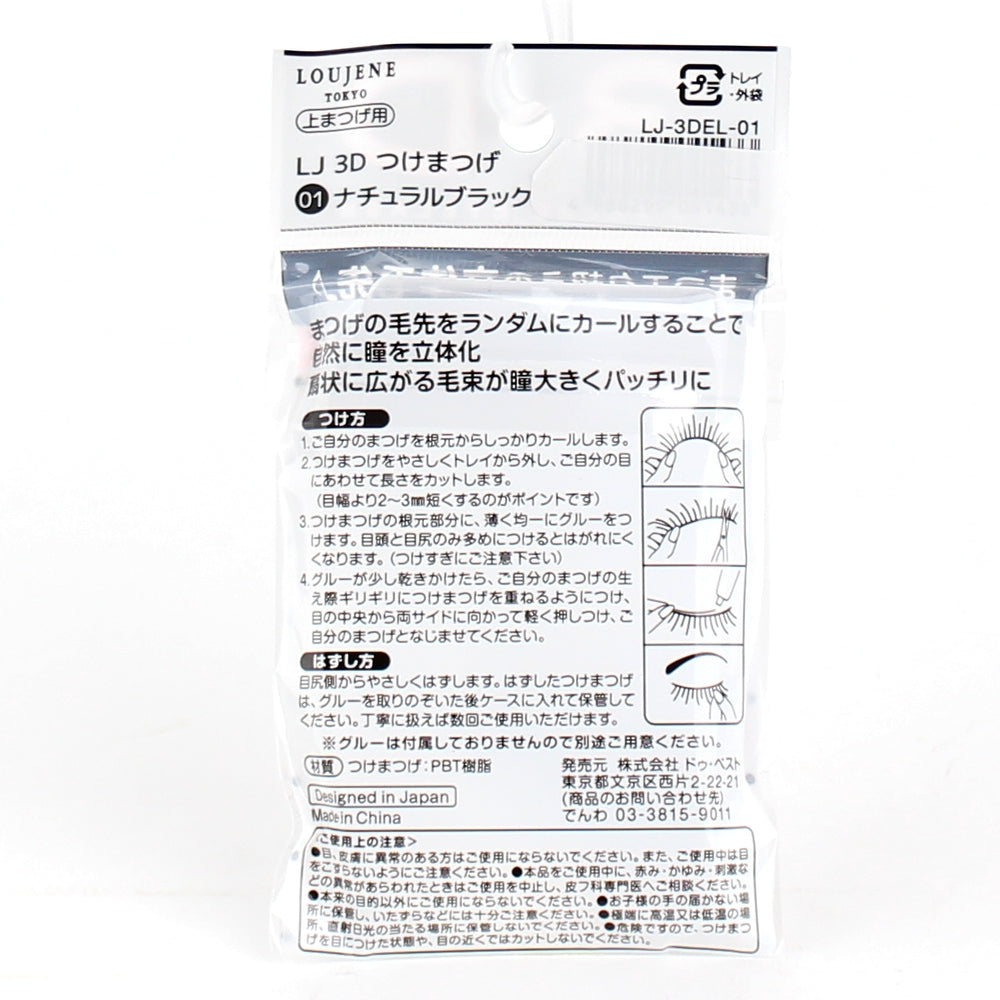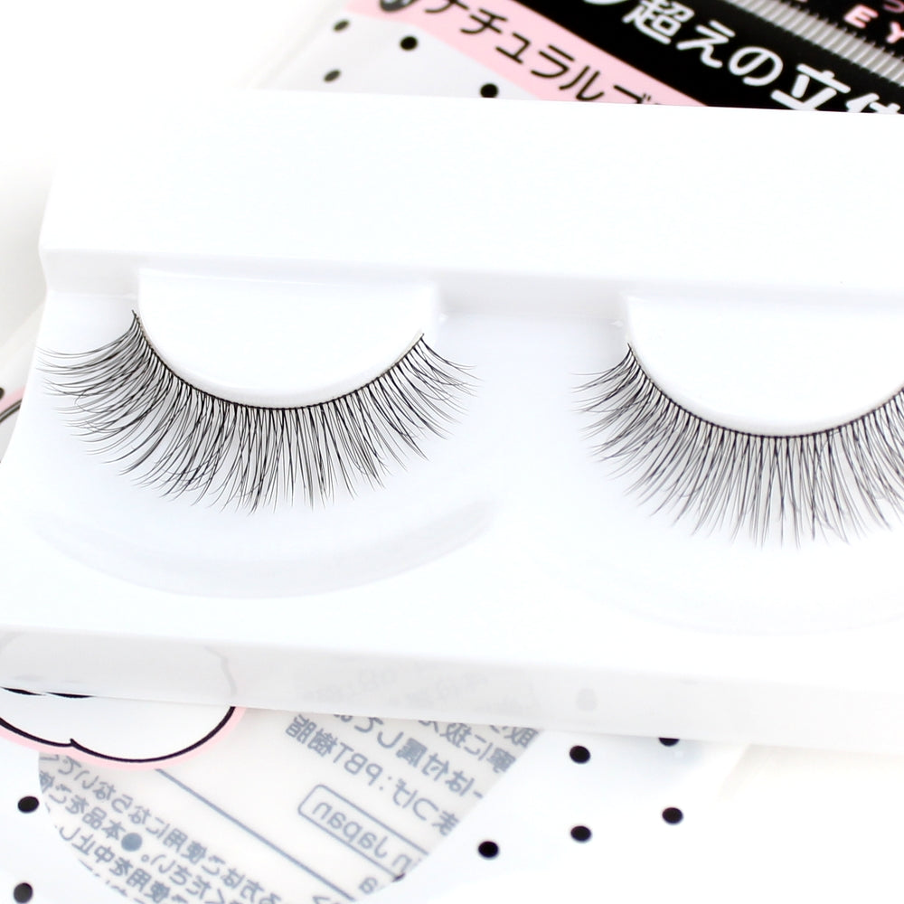 False eyelashes that are interspersed randomly with curled lashes, just like real eyelashes. Add impact and dimension to your eyes with these false lashes that are curled at the top and bottom. Soft and long bundles of hair are designed to fan out, making your eyes look rounder and bigger. Comes in a natural black colour.