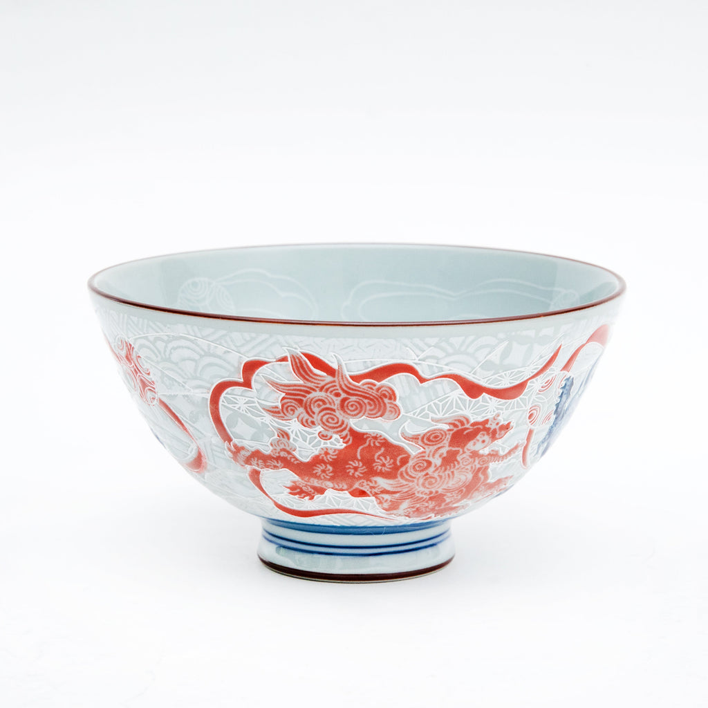 The painting of the Chinese lion is depicted in underglaze blue, making it distinctive as a good luck charm. Its depth makes it easy to serve rice, and it is less likely for soup or toppings to spill. Made in Japan.