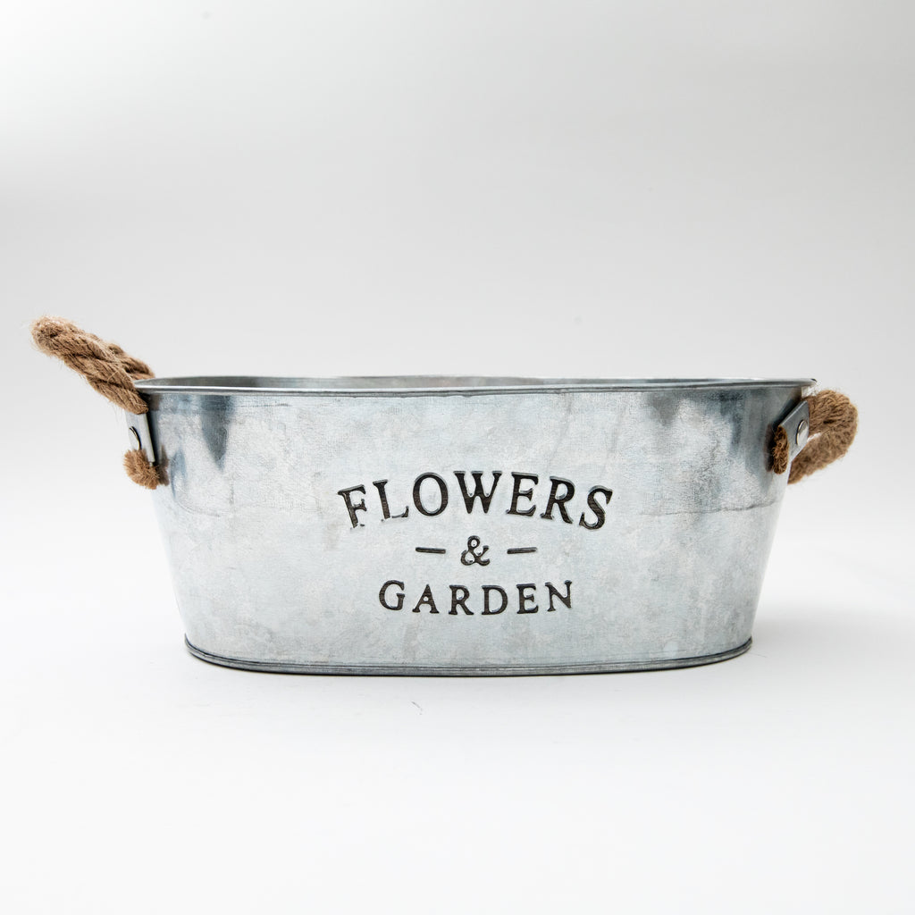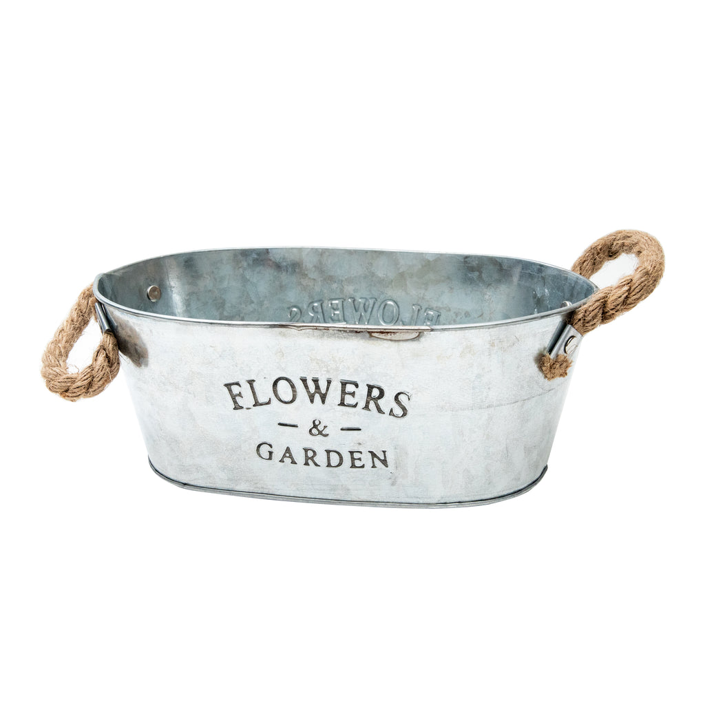 Adorable tin bucket that is perfect to use to display flower pots and more. Comes with a hemp handle. Comes in a stylish, antique aesthetic and is well suited to hold small planters, or as a container for small items.