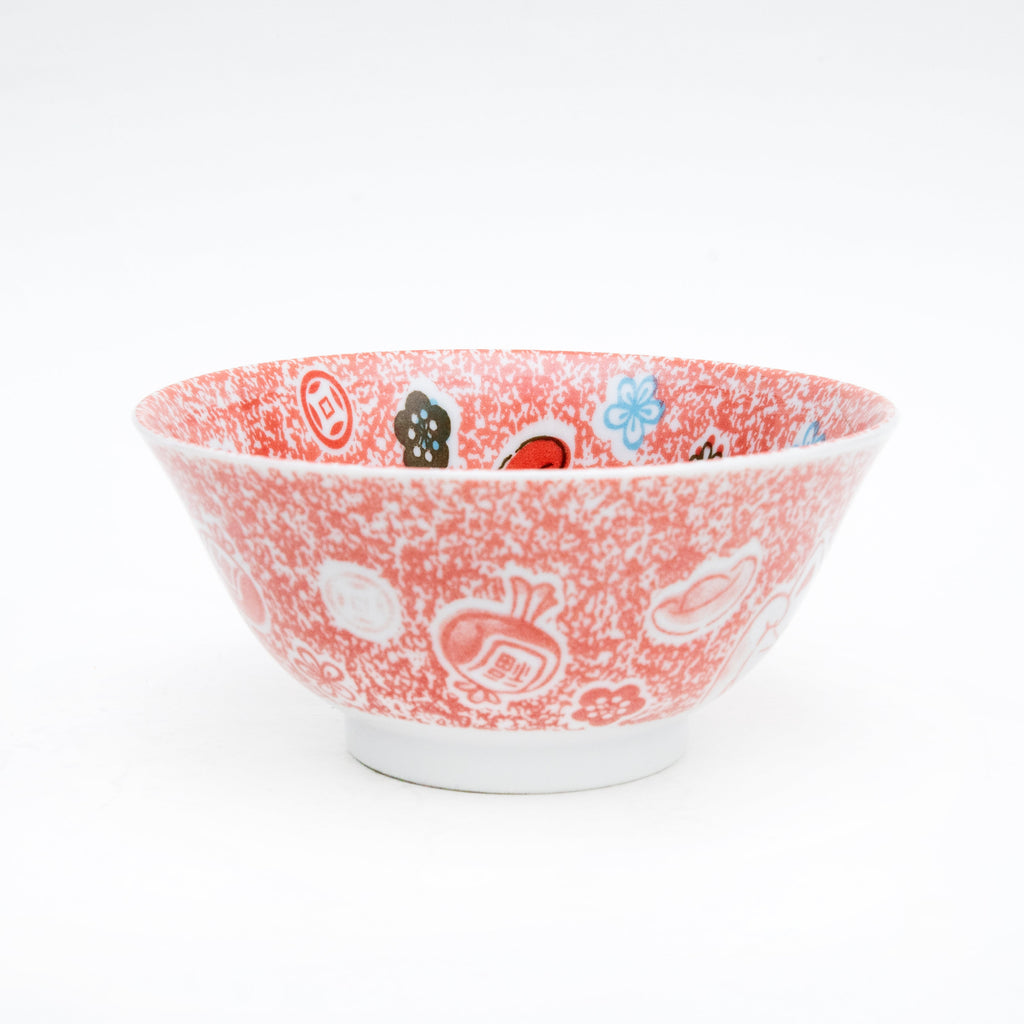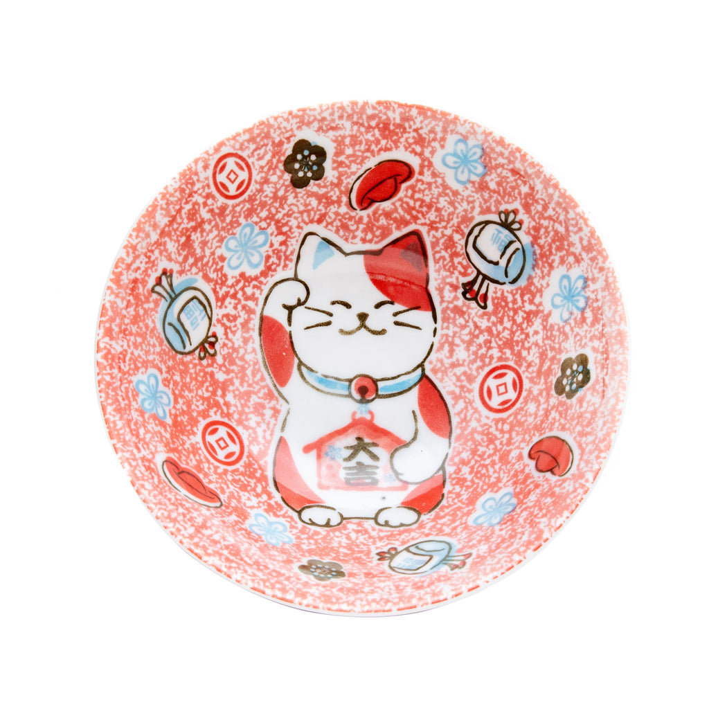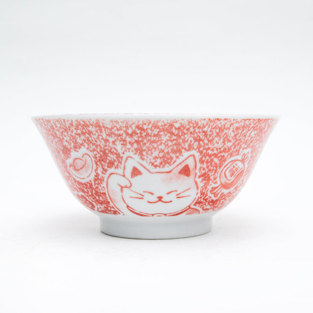 This is a Japanese tableware designed with a 'Maneki Neko' (beckoning cat) as a good luck charm. It is a versatile small bowl (donburi) that can be used for rice, noodles, soup, or as a small dish. Color: red. Made in Japan.