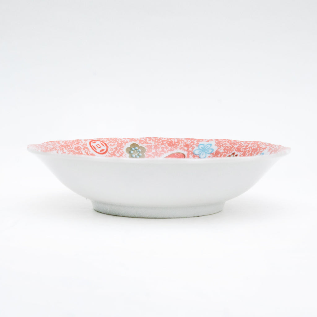 This is a Japanese tableware designed with a 'Maneki Neko' (beckoning cat) as a good luck charm. It is a shallow bowl (shallow donburi), suitable for rice with a little side dish, ramen, udon, or small donburi dishes. Color: red. Made in Japan.