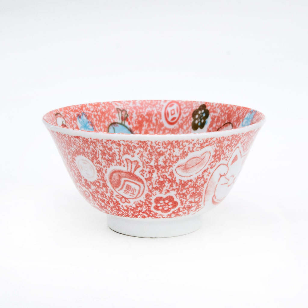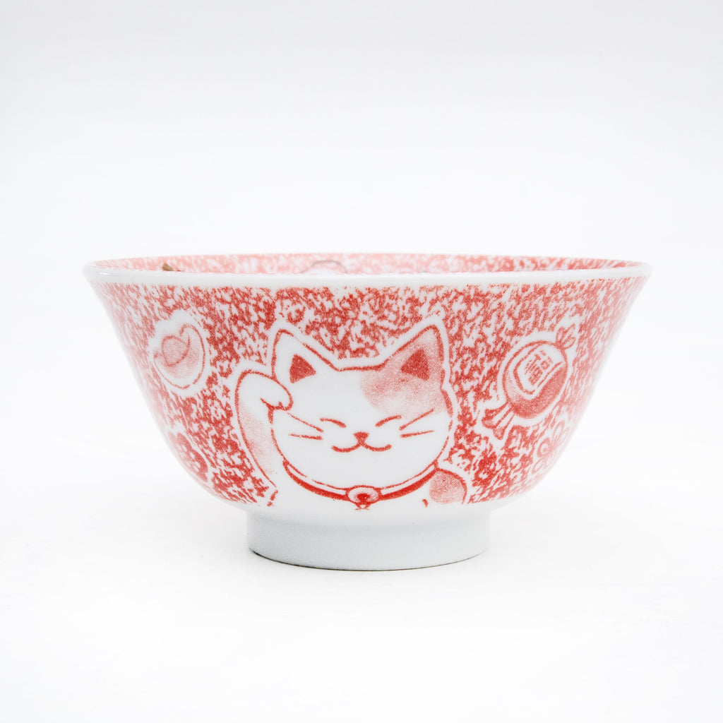 This is a Japanese tableware designed with a 'Maneki Neko' (beckoning cat) motif as a good luck charm; it is a smaller bowl suitable for rice, noodles, udon, soup, and small side dishes. Color: red. Made in Japan.