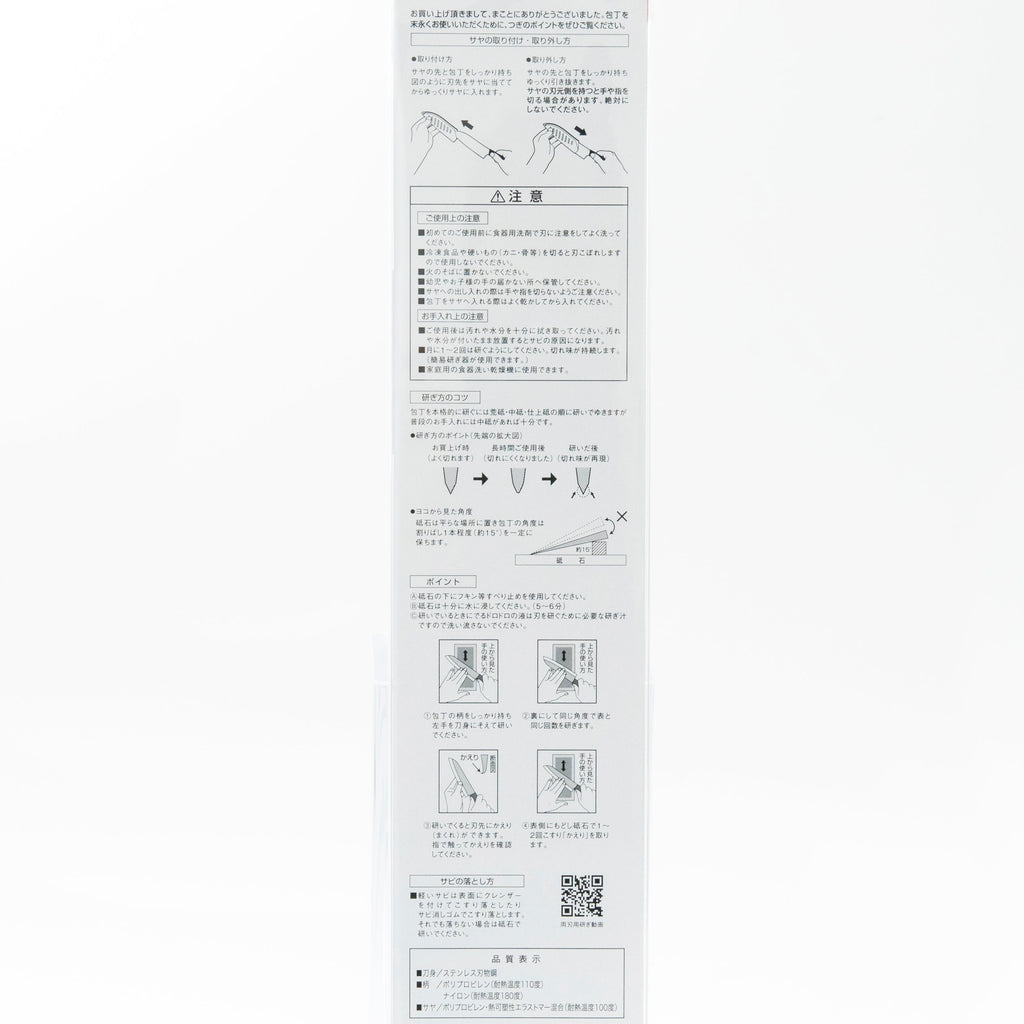 Chef's knife that comes with a handy sheath for storage. The sharpness of the blade enhances the flavours of the ingredients. Made in pursuit of a product with weight, shape and sharpness features that will appeal to women. Comes with a lightweight and easy to use stability, featuring a small handle for an easier grip. Made in Japan.