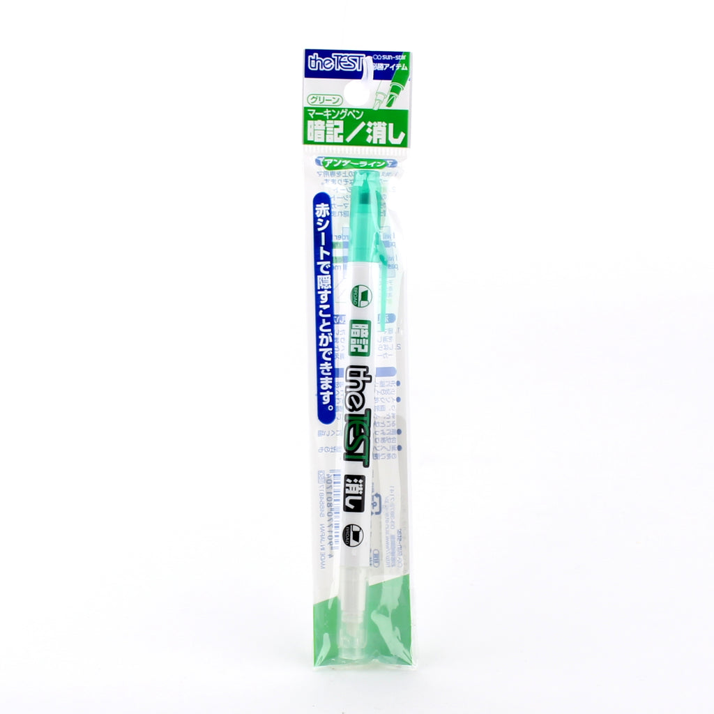 Made in Japan. Double-ended pen with a green highlighter and eraser tips for memorization exercises. Use the green end to highlight where you want to memorize and the eraser end to remove the highlighted area.