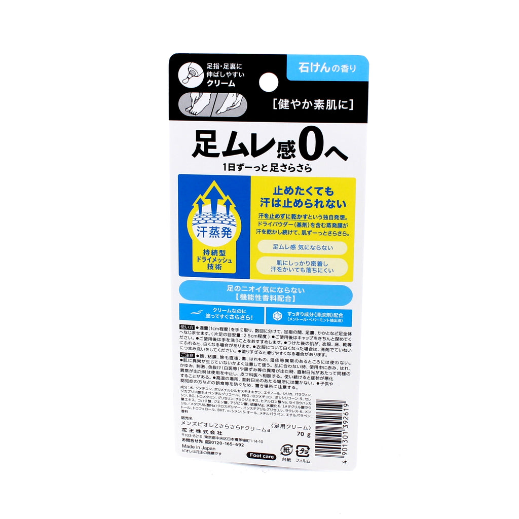 With this cream, you will no longer feel stuffy in your shoes. Your feet will be dry and smooth all day long. We came up with an original idea to dry the sweat without preventing it using our long-lasting mesh and drying technique. Using dry powder as a base, the evaporation film continuously dries the sweat and keeps the skin smooth. This 70g product is enough for applying to toes and soles and keeps the bad odours away. You can apply it for wearing leather shoes too! It will keep your skin healthy. Reduce the feeling of stuffiness. The cream will stick to your skin and will not easily be washed away by sweat. The cream turns to a smooth texture right after the application! The infused menthol and peppermint oil will keep your feet cool. The eucalyptus and butylene glycol will provide moisture to the skin. Soap scent. Made in Japan.
