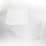 Clear plastic, slim type storage box with lid. Holding capacity 2.9L. The opaque white colour doesn't show the contents of the box, making it an ideal storage option for items you may not want out in the open. This container can be stacked with other containers from the same series, making it especially useful to organize inside shelves or drawers. Made in Japan.
