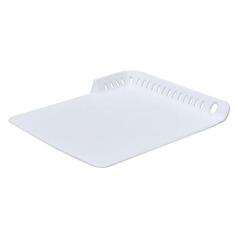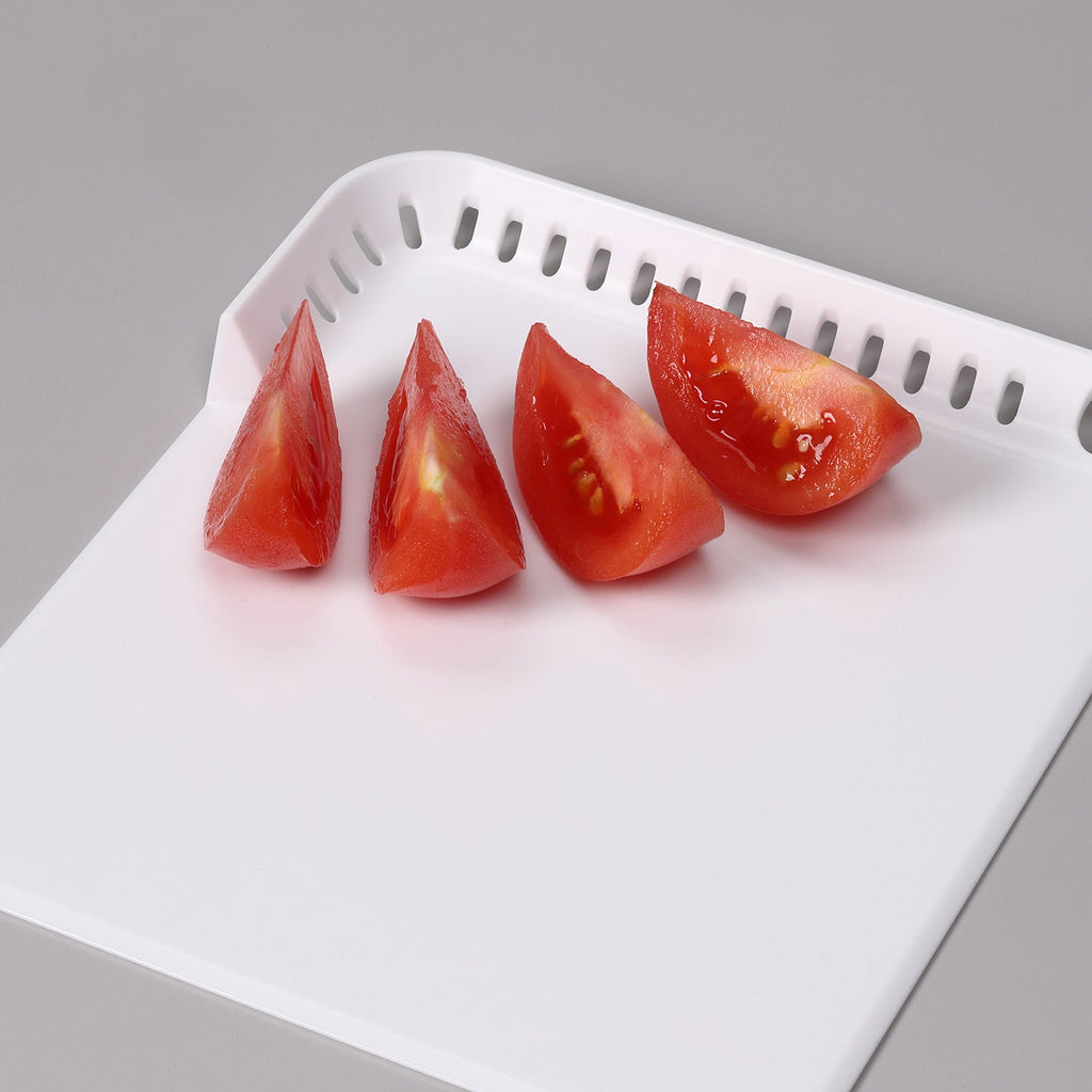 This Japanese cutting board is designed for quick and easy food prep in any kitchen. Best for chopping fruits, vegetables, and condiments, it features a corner guard to keep ingredients from rolling away and a built-in drainage hole for easy cleanup. Made from durable polypropylene (PP), it combines functionality with a sleek, minimalist design. Made in Japan.