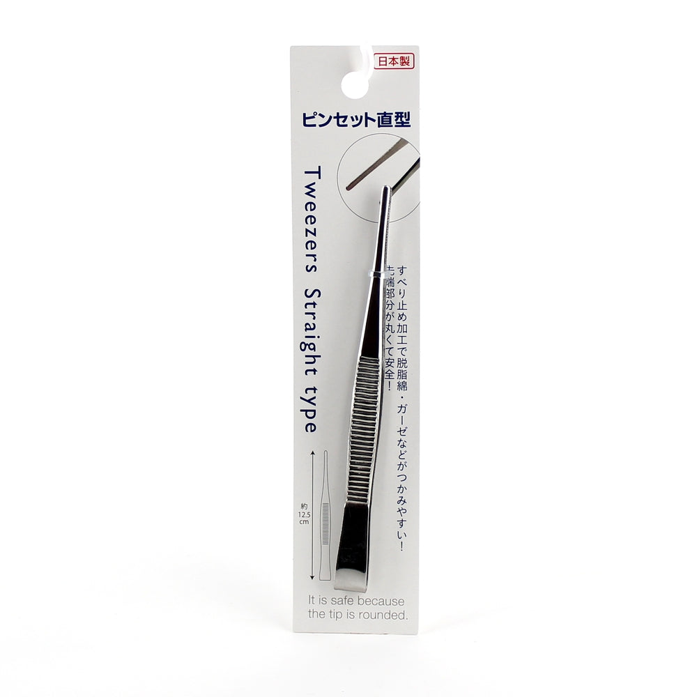Set of straight type tweezers. Processed with a no-slip grip, it is easy to grasp gauze etc. with these tweezers. The tips of these tweezers are rounded, so you can use them easily with peace of mind. Made in Japan.
