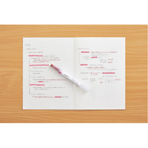 Bicolour highlighter pen that keeps your important notes in notebooks looking well organized, neat and tidy. Try layering lighter colours over bolder colours of the same tone to add interest and definition to your memos and notes. These pens use special ink that will not strain or feel harsh to your eyes. Made in Japan.