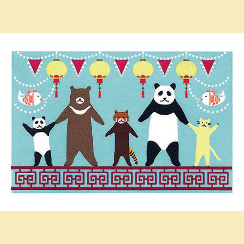 This greeting card features a colourful and unique illustration. Made using eco-friendly vegetable based ink. Comes in a panda and bear theme. Made in Japan.