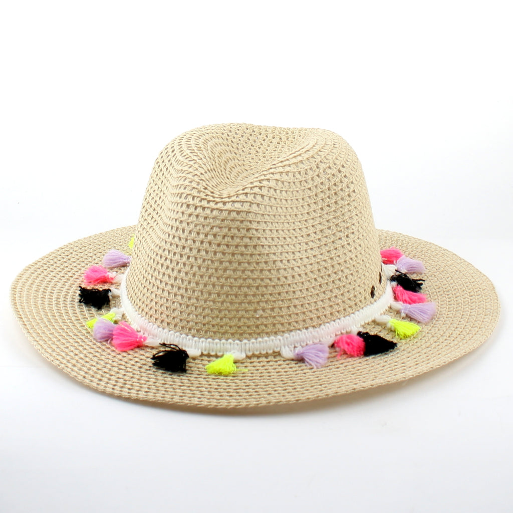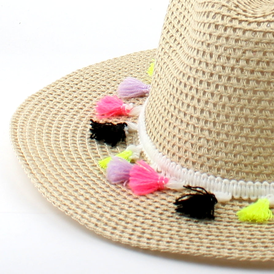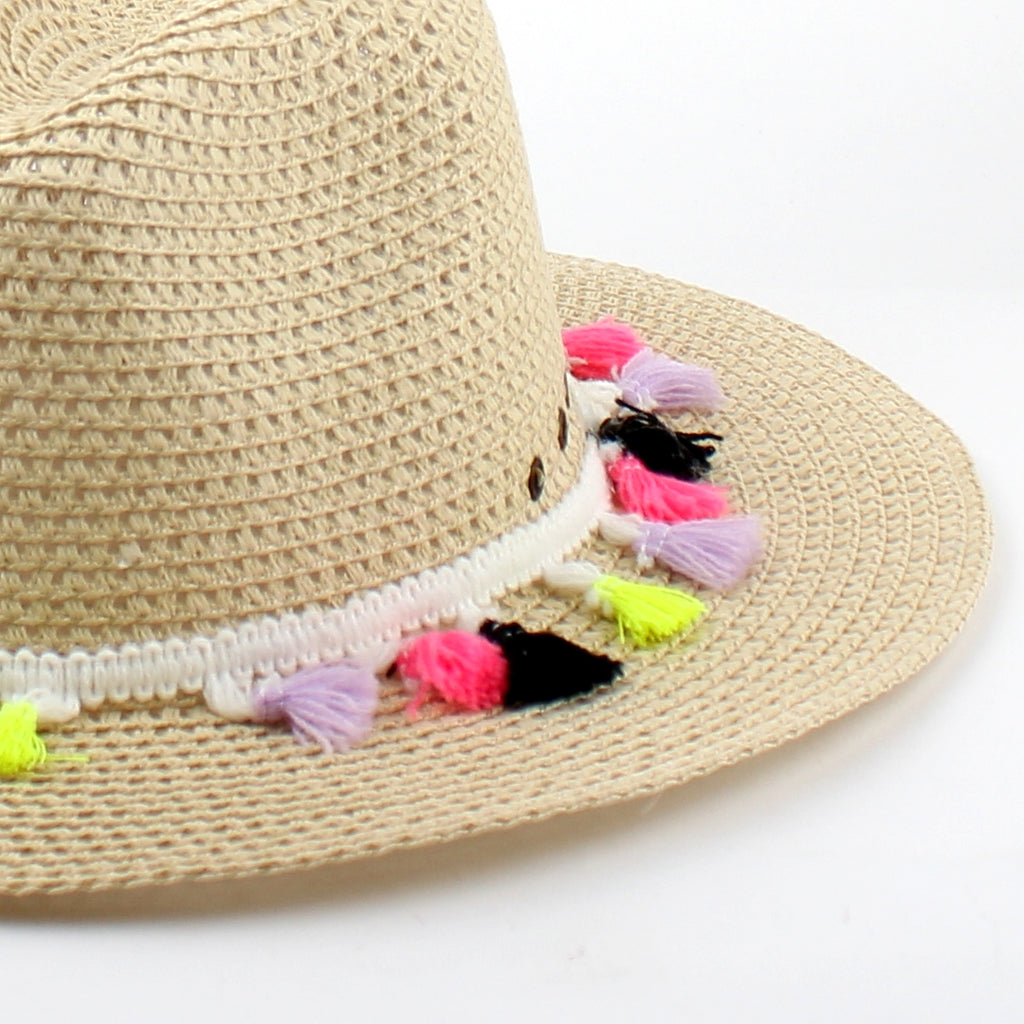 Wide brimmed woven summer hat that comes with colourful tassels. Simply add this hat to your outfit and enjoy being the centre of attention this summer season.