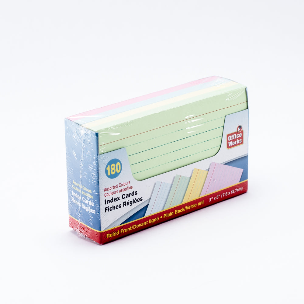 3 x 5" ruled ondex cards with assorted colour. 180 sheets per pack.
