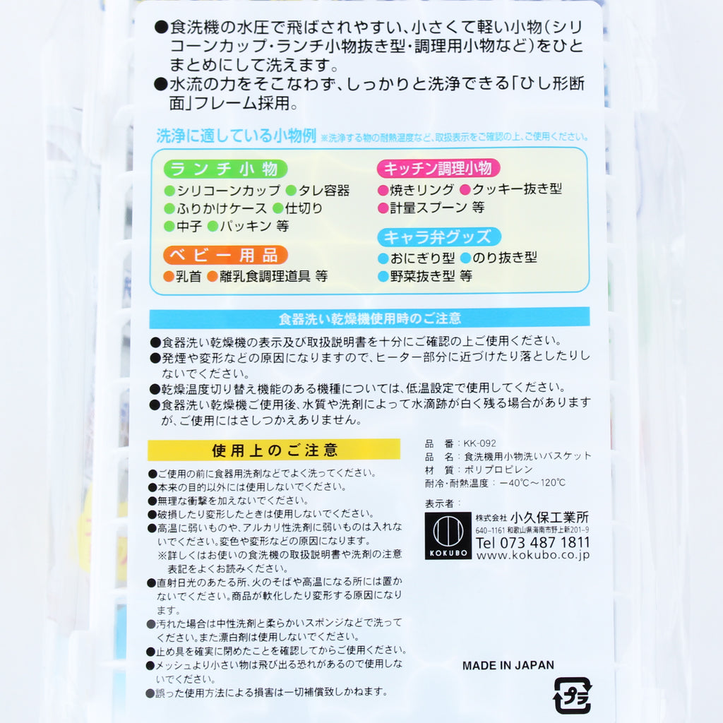 Convenient storage basket to hold smaller items in the dishwasher. Small items can be washed together without being blown away by the water pressure. Simply attach with the accessory fixing pin included inside the basket. Will not fall apart easily. Made in Japan.